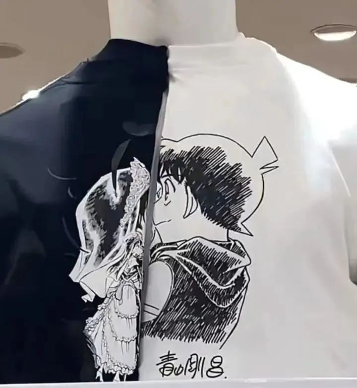 不仅如此,作者青山刚昌在多款衣服中挑“柯哀”T恤穿,并只在这款留下亲笔签名。