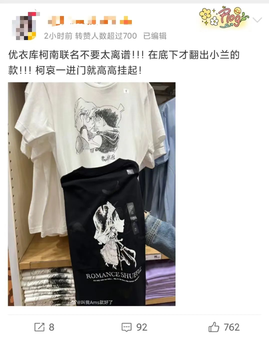 再加上,优衣库联名款出现的时机正确。有中国粉丝参加《名侦探柯南:黑铁的鱼影》的试映会后透剧,表示灰原哀亲了柯南 (实际上是人工呼吸) ,然后又亲了毛利兰,把吻还回去。虽然内容已删,但是影片正式上映后, #柯哀亲了# 等话题冲上热搜。