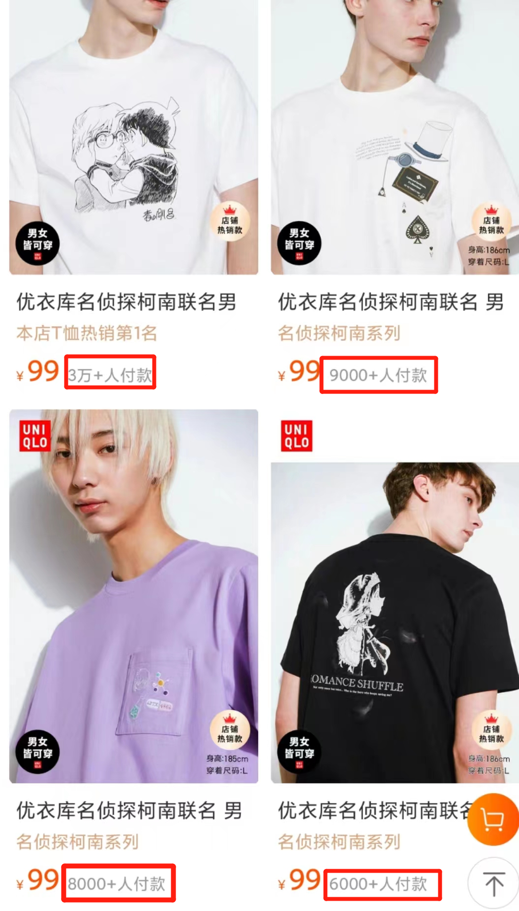 再加看看“战况”,“柯哀”T恤在优衣库淘宝官网上 月销有3万+ ,其他款销量也不少。