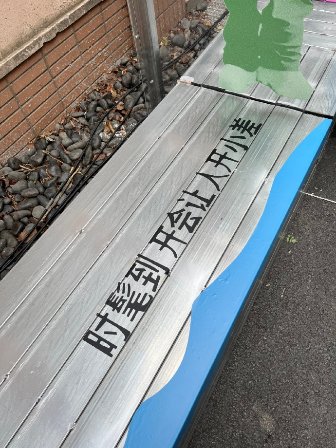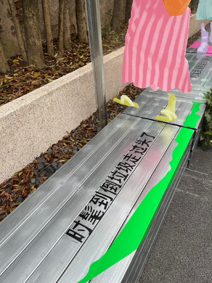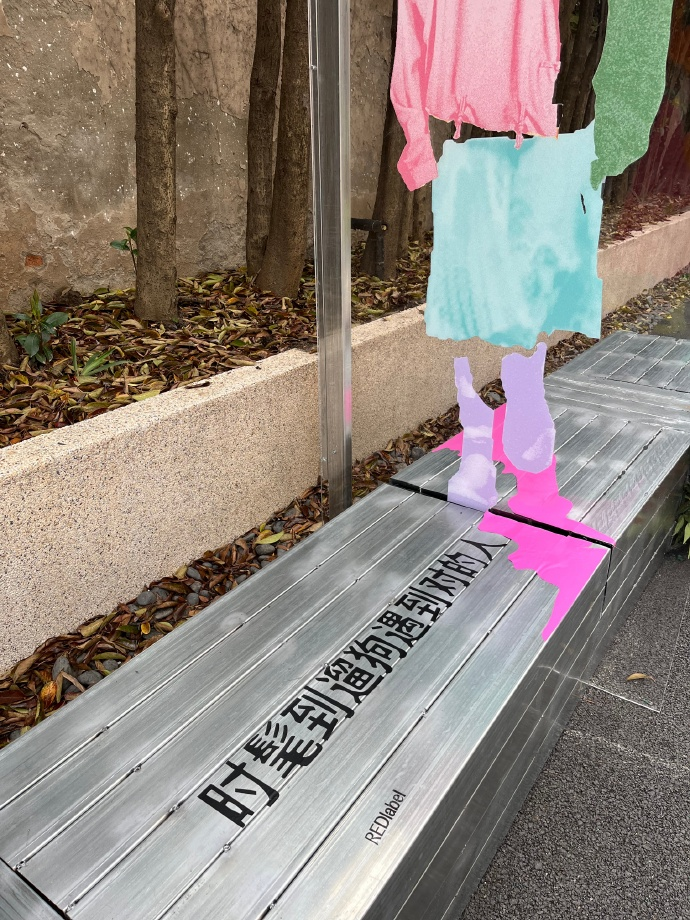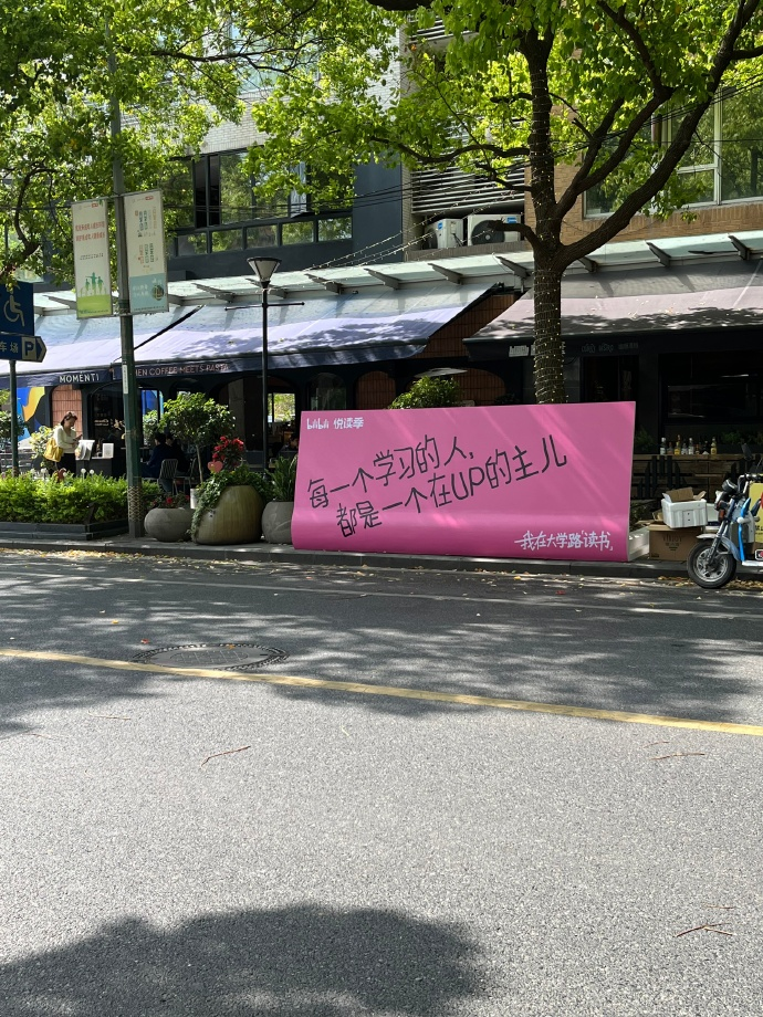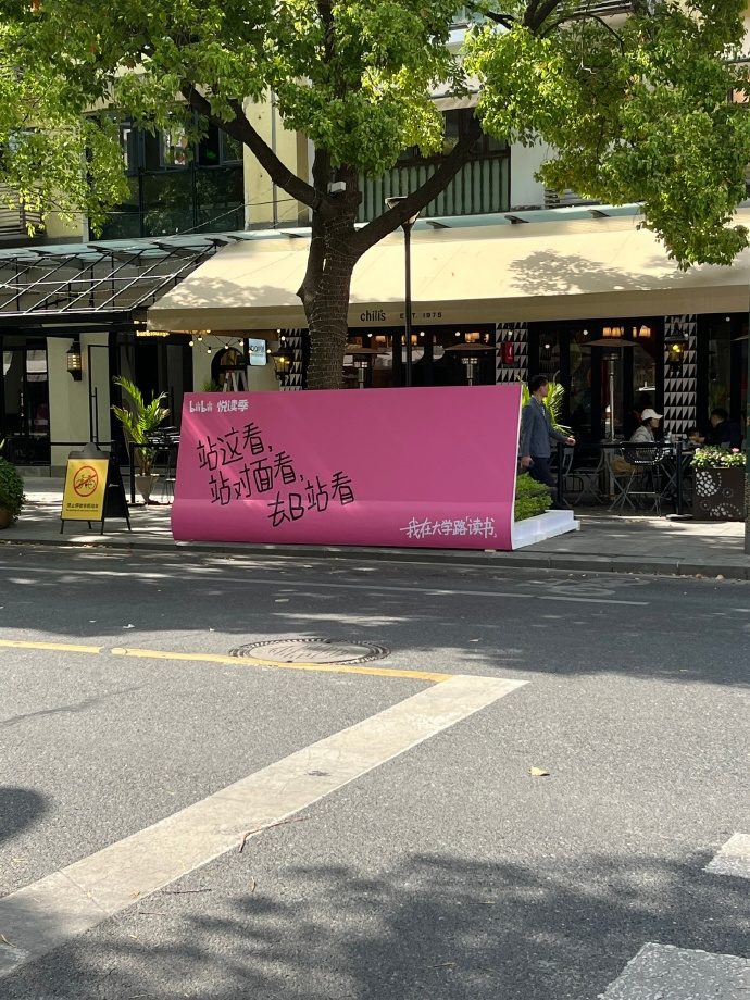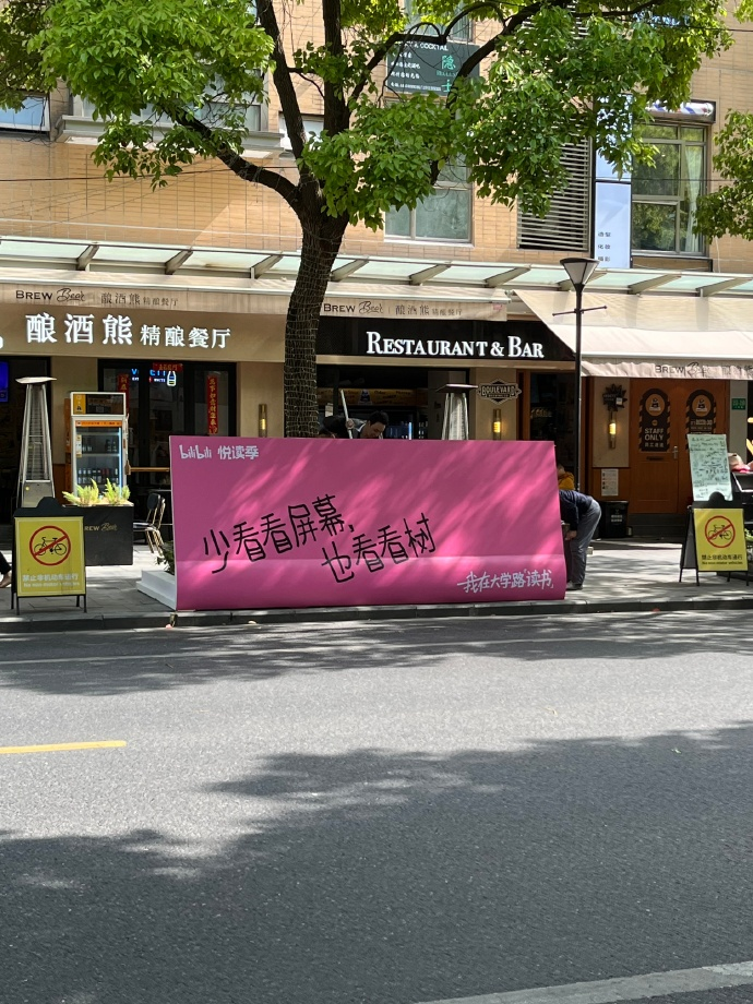 好玩的是,海报背后就靠着大树。 (过度解读一下:是不是也有点是让大家多看看树身上的户外展板的文案?)