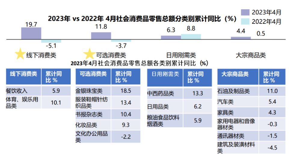 从消费市场细分品类看,2023年开年社会消费品零售增长主要由社交属性相关消费拉升。社交场景回归带来线下娱乐餐饮以及带来更多个人附加属性的品类涨势较好;另外,日用刚需品类增速稳定,但较高金额的大宗商品类增速相对较低,体现我国经济尚在修复进程中。