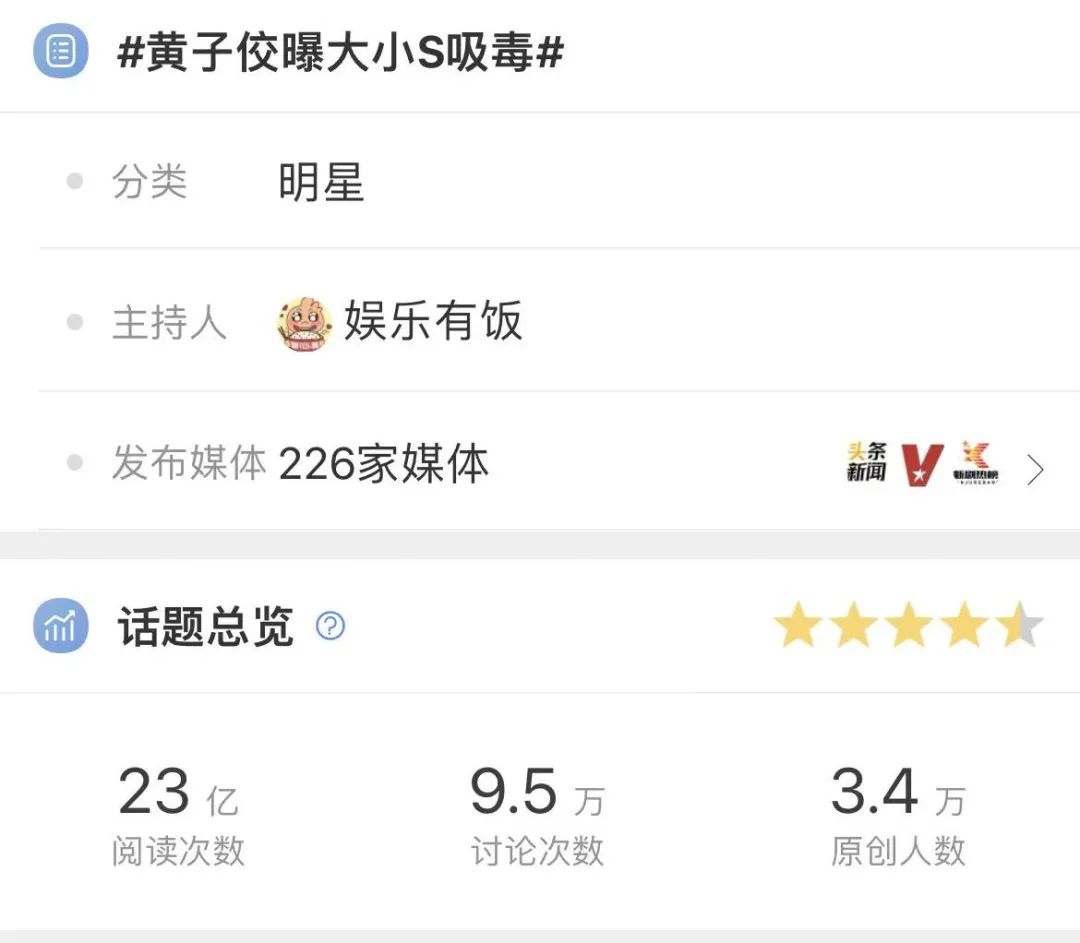 光#黄子佼曝大小S吸毒#一个话题的阅读量便已突破23亿!