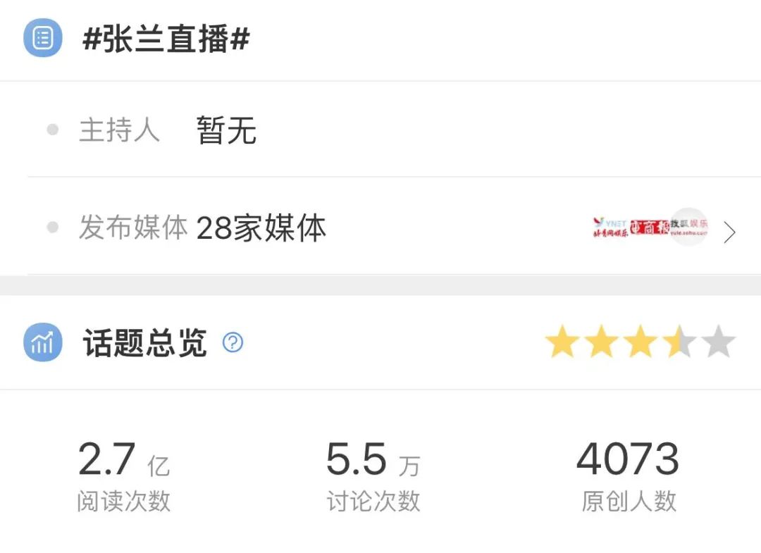 而在社交圈,#张兰直播#话题阅读量也高达2.7亿!