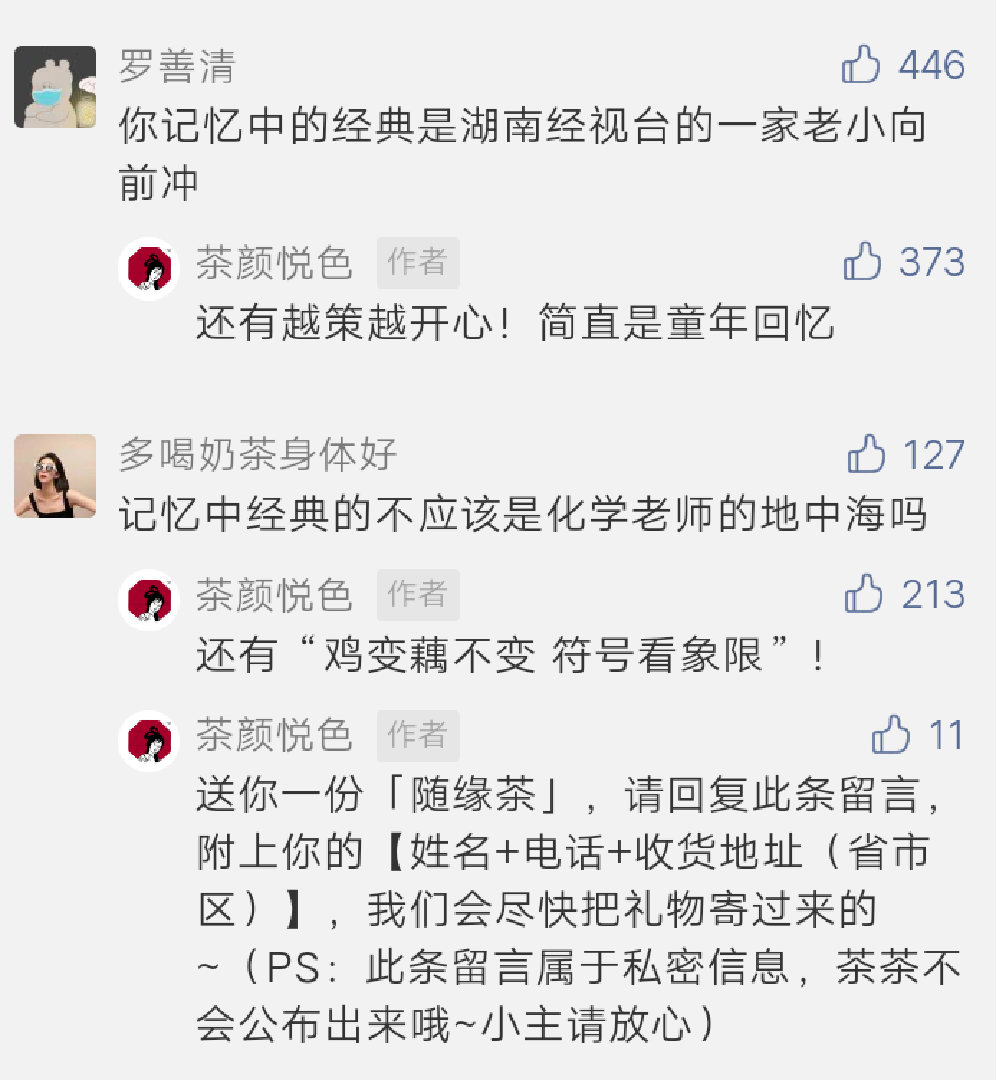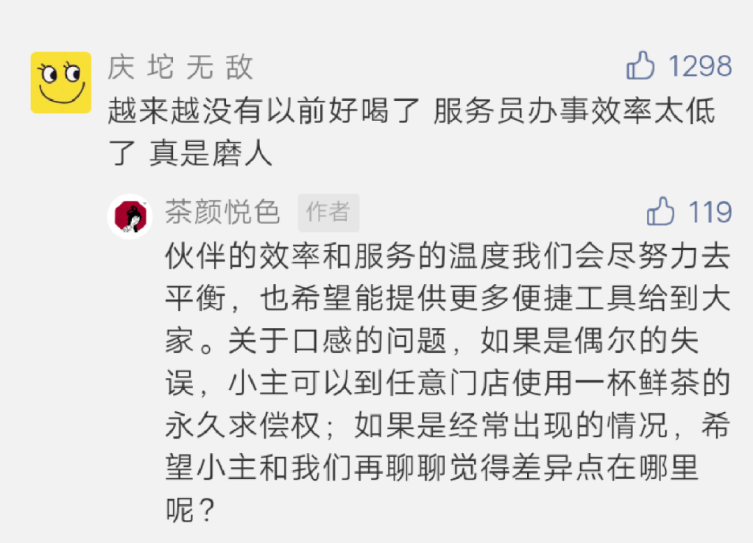 和老乡鸡做得一样好的是茶颜悦色,她的每一个回复都有情感、有真实。不要小看这些操作,每一个微小的浪花积攒就会形成汪洋大海。顾客口碑的传播是指数级的,只要突破了某个边界就会自动传播。
