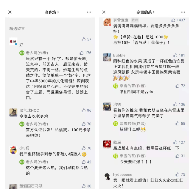 对比老乡鸡和奈雪,会发现虽然两个品牌都会回复粉丝留言,但是老乡鸡的语言风格更有趣,更能和粉丝打成一片。
