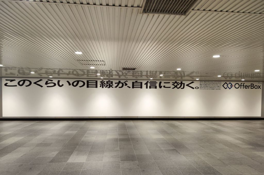 点评:和常规地铁文案所摆放的位置不同,该品牌主特意将文案放在平视视线的上方。实际上,这是为了配合文案的有意为之。文案“このくらいの目線が、自信に効く。”意指“把目光抬到这个位置,(你)看上去更自信。”面对辛苦的求职过程,求职者的情绪难免焦虑,洞察到这点的OfferBox则基于“抬头能让心情变得更积极”的行为心理和暖心鼓励的出发点,希望大家抬头行进,重获自信心态。你有被暖到吗?