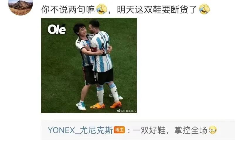 点评:在“梅西男孩”闯入赛场前,YONEX尤尼克斯应该怎么也想不到,自己会出现在热搜榜上。值得一提的是,天降流量后,YONEX官方也做出了相对克制的回应。先是品牌主播在直播间迅速与此事件关联进行宣传,随后品牌小编在面对网友的催更时,仅低调重复了一遍广告语“一双好鞋,掌控全场”,不言更多的回应态度让让这句宣传语显得更有说服力!