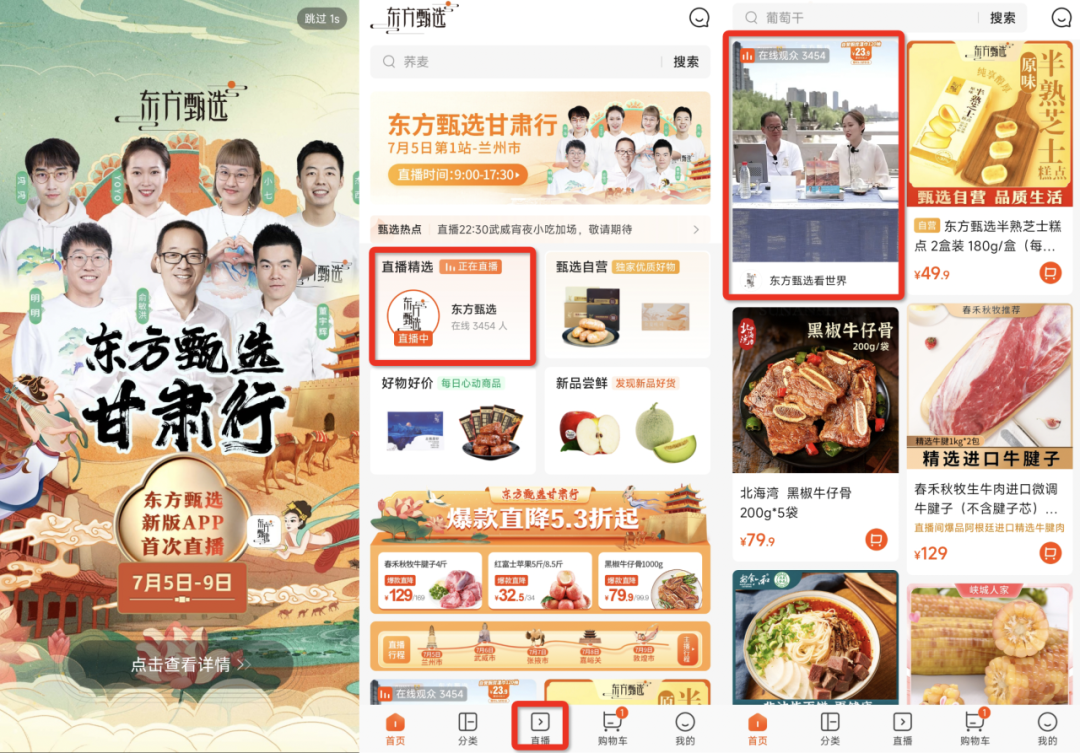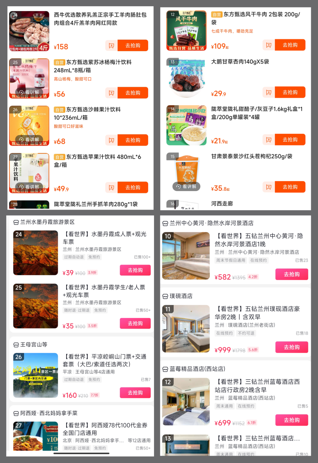 7月5日的这场“甘肃行”直播,在抖音、东方甄选APP同步进行。APP的直播产品界面几乎照搬了抖音,直播内容完全一致,但选品不同——抖音平台以酒店、跟团游为主,决策重、单价高。而消费频次高、价格门槛低的农产品,悉数被搬到了东方甄选APP。