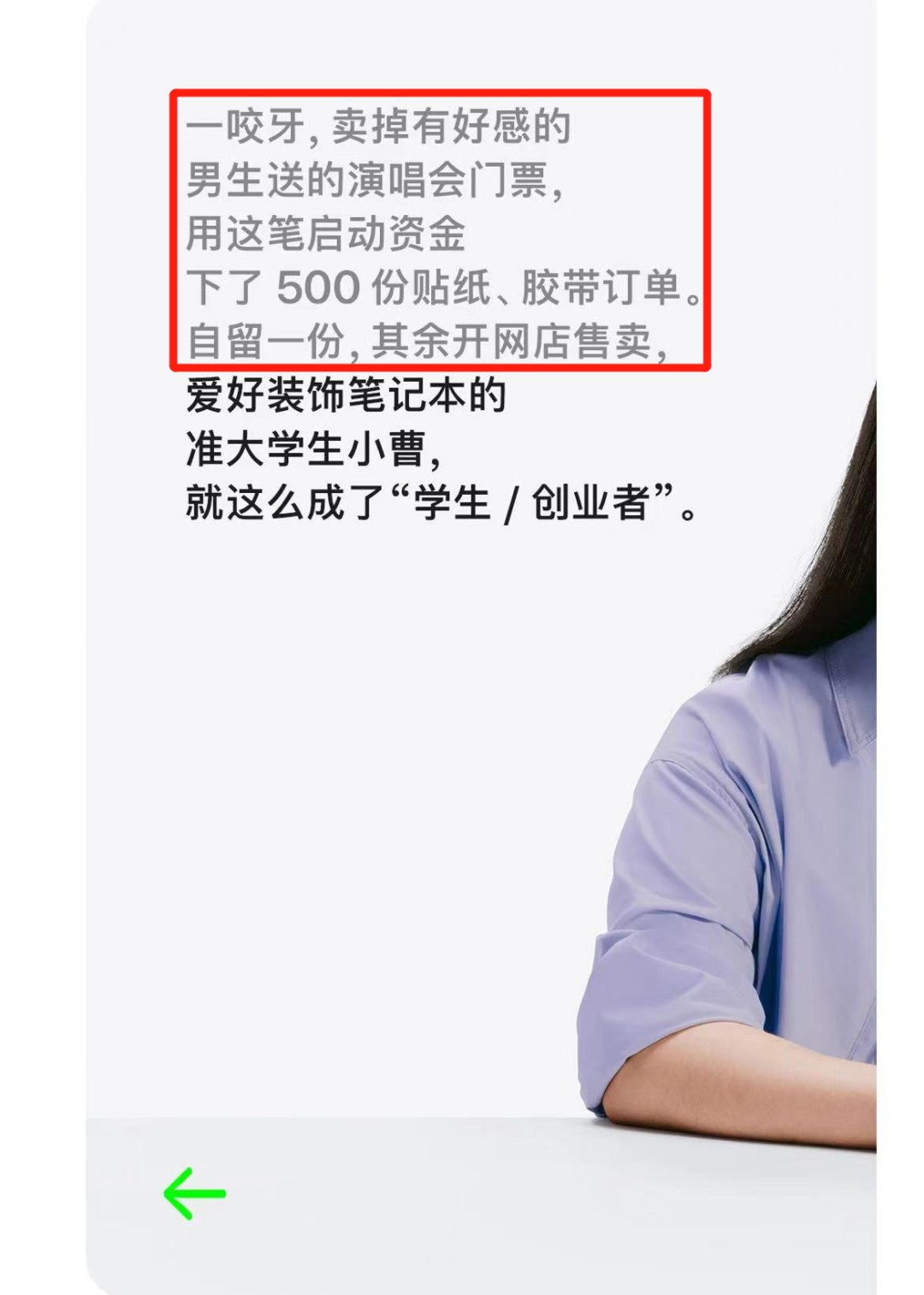 “一咬牙,卖掉有好感的男生送的演唱会门票,用这笔启动资金下了500份贴纸、胶带订单,自留一份,其余开网店售卖”