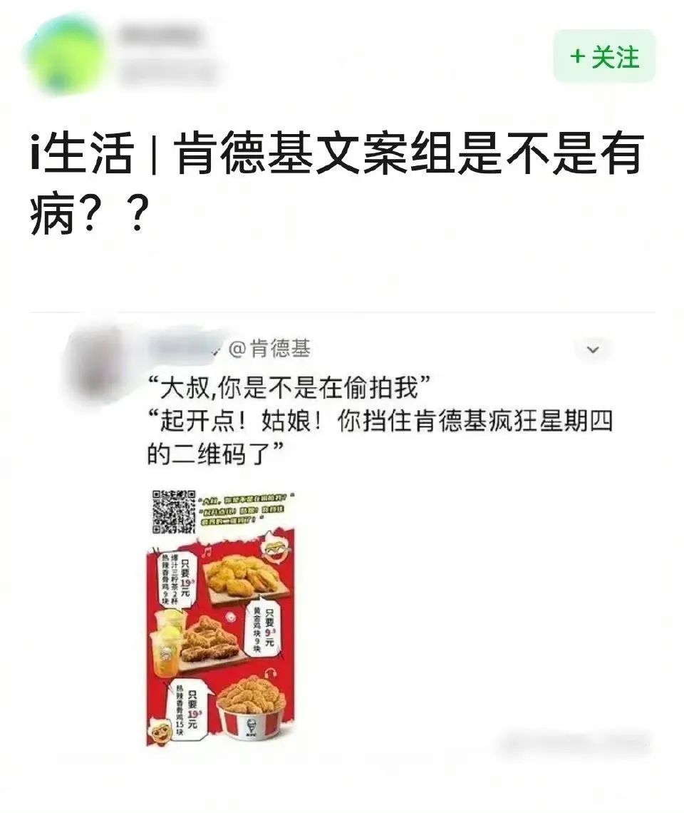 没错,就是在川大女生假偷拍事件,引发网络对男女性别,以及偷拍这类事件的大范围争论时,肯德基借势炒作了此事,然后被骂低级,甚至还有大量网友前去它的微博底下讨个说法。