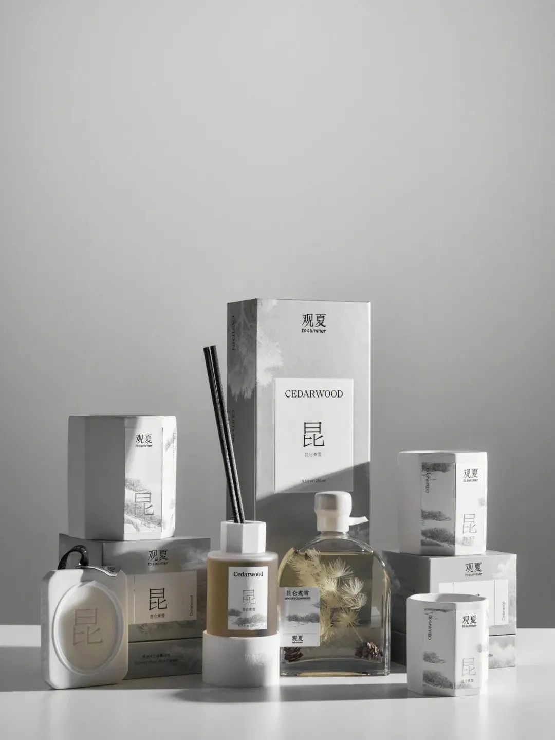 原创东方植物调的香氛品牌「观夏」,回归东方传统,包装设计上除了自身logo和产品名,其余地方都是极简留白,营造记忆中山河原野、人间草木的氛围感,让人犹如置身东方诗意场景,引发无限遐想。
