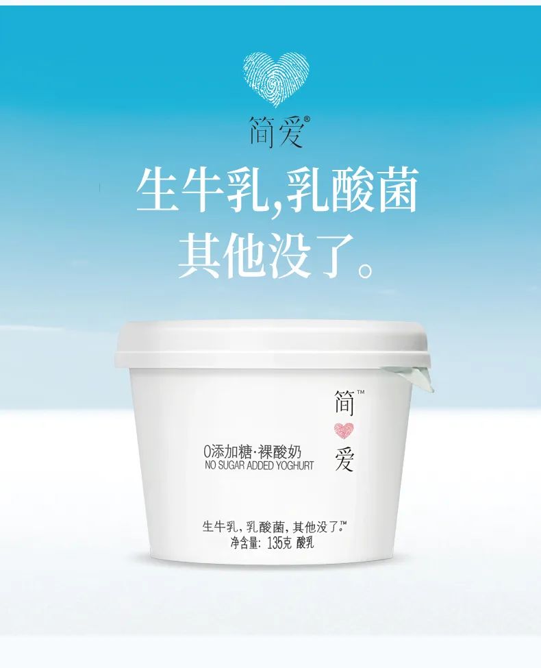 同样做法的,还有简爱无糖酸奶,直接将食品原料放在产品包装上,“生牛乳、糖、软酸菌,其他没了”。无需大费周折强调“健康、无添加”,客户一看就懂了。