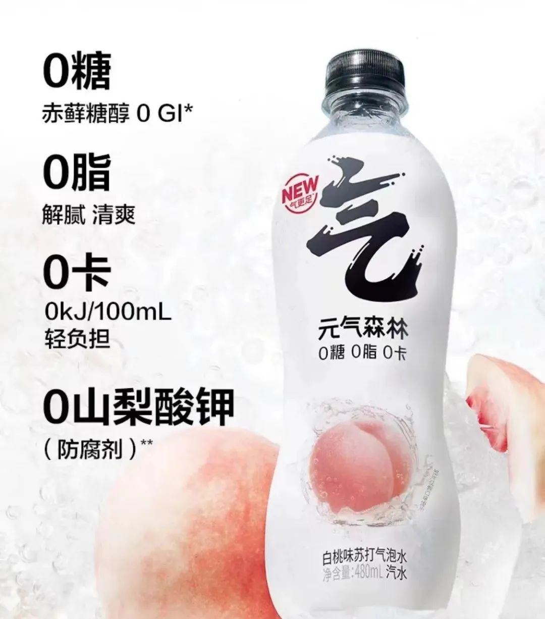 比如元气森林气泡水包装用了一个大大的“气”字,强调气泡水细分领域开创者地位和“气很足”的产品特点,在第一时间吸引用户目光,第二视觉是“0糖0脂0卡”生产工艺,契合年轻人对健康瘦身需求,自然带动转化。