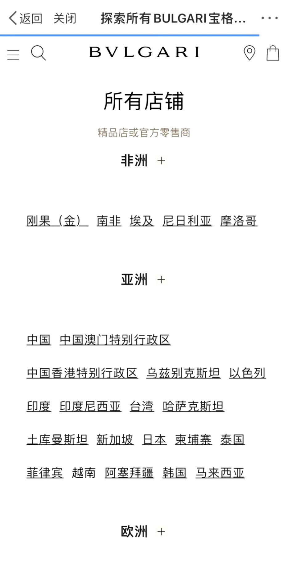 宝格丽品牌官网的店铺分布信息中