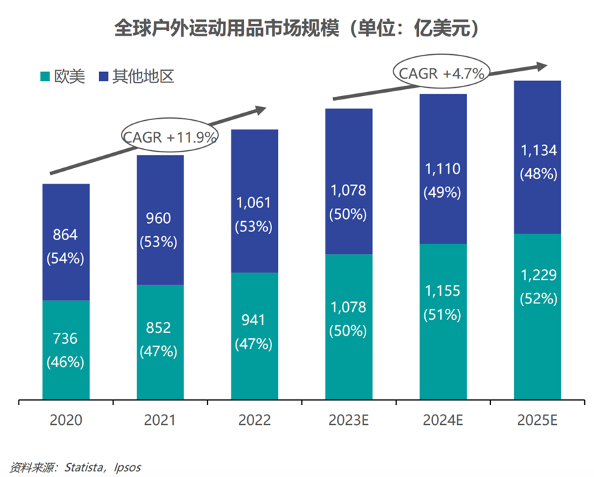 疫情过后,户外运动在全球似乎更风靡了。据Statista数据显示,2022年全球户外运动用品市场规模达2002亿美元,过往三年CAGR为11.9%。预计2025年行业规模将达2363亿美元,尽管增速放缓,但规模仍稳步上升。