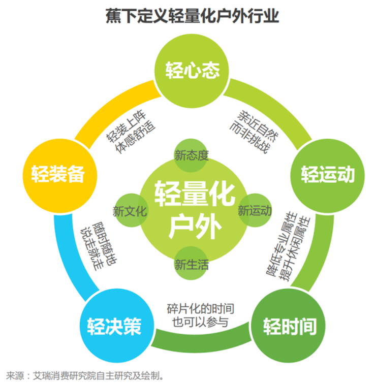 不仅如此,蕉下还为“轻量化户外”赋予了五大内涵,即轻装备、轻心态、轻运动、轻时间以及轻决策。蕉下联合艾瑞咨询发布的《轻量化户外运动白皮书》指出,轻量化户外不仅是轻型户外运动的集合,也是新运动和新场景下用户新需求的产品解决新方案,同时它更是一种新的自然态度,一种新的户外生活方式,未来还有可能成为一种新的潮流文化。