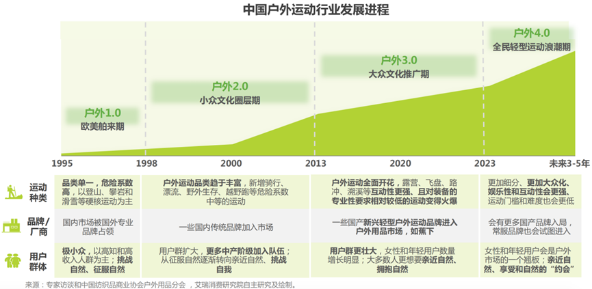 据艾瑞咨询显示,中国户外运动行业历经“欧美舶来期—小众文化圈层期—大众文化推广期”三个阶段,目前正处于“全民轻型运动浪潮期”的4.0时代。
