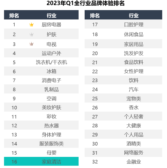 新锶体验新发布的2023年Q1品牌体验榜单中,家庭清洁行业在全行业中排名第16,其行业品牌体验指数为51,高于全行业平均。