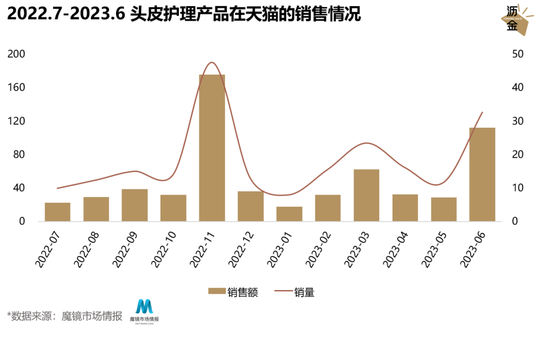 从销售情况来看,2022年7月至今年6月,头皮护理产品在淘宝的销售额达2.6亿元,同比暴涨1135.2%;销量达81.9万件,同比大涨522.8%。