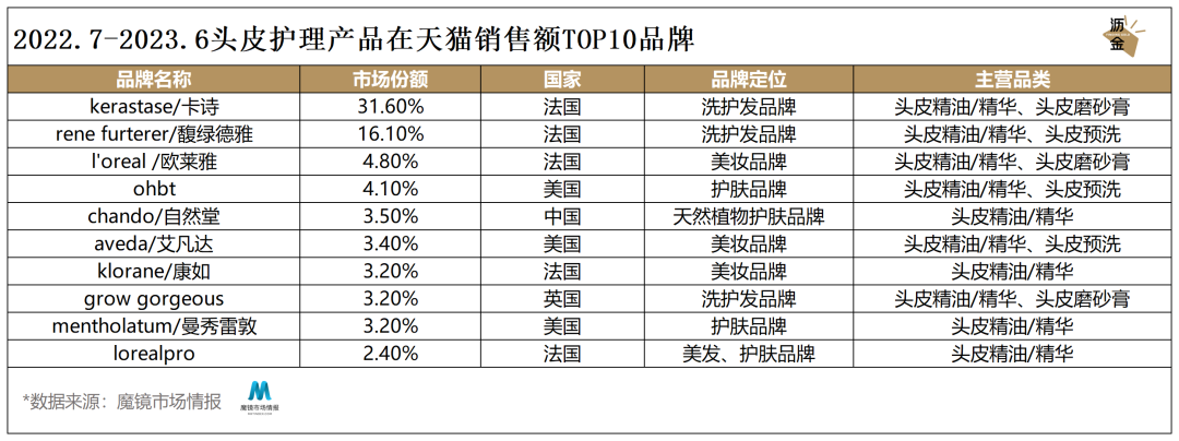 天猫的头皮护理品类由海外品牌主导,销售额TOP10榜单中仅有一个国货品牌。其中,法国洗护发品牌卡诗占市场份额最高,达31.6%。