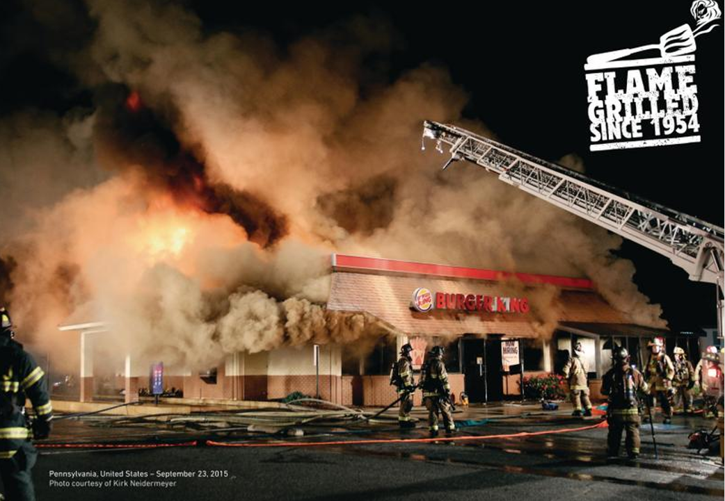 汉堡王广告的画面中是消防员救火场景,表面上是汉堡王的门店失火,实际上是说汉堡王的牛排是用火来炙烤的,汉堡王在3个平面广告中都使用这种手法,以一种类自嘲的方式提升了品牌广告的趣味性。