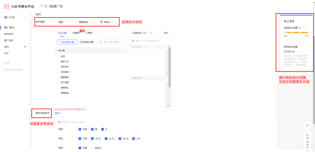 2、不同行业高价值人群画像是不同的,需要在投放之前做好产品分析,从(年龄,性别,地域,兴趣)这四个维度;