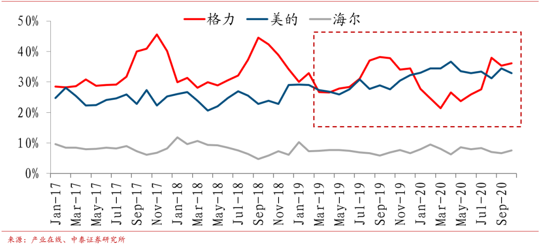 2017-2020三大白电空调出货份额对比。图/中泰证券