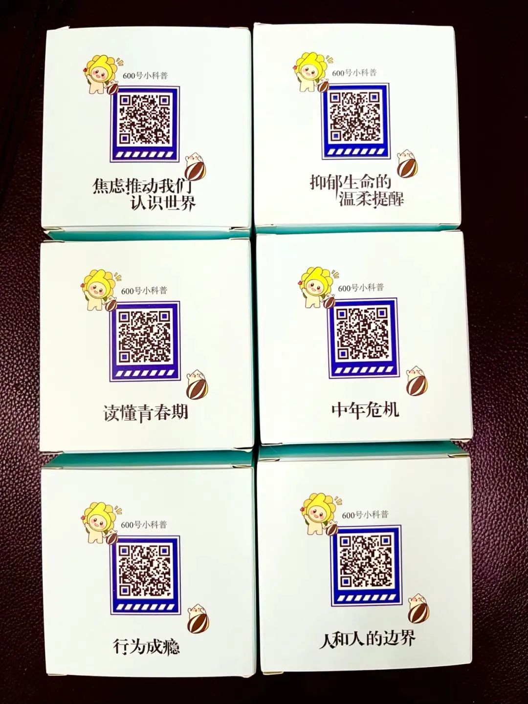 再看月饼,高饱和度颜色,6个口味,分别对应6种不同的心理情绪。每个盒子背后都印有二维码,扫码可听“科普”,分别是:中年危机、行为成瘾、抑郁、焦虑、青春期、边界感等。