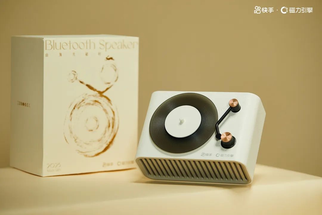 此外,快手还有一款礼盒,来自磁力引擎,主题是"山海共磁时"。“磁”与“此”谐音,既有“天涯共此时”的中秋表达,也代表磁力让品牌更有吸引力的使命。像大饼一样的是块地毯,配个小音箱,可以做冥想。