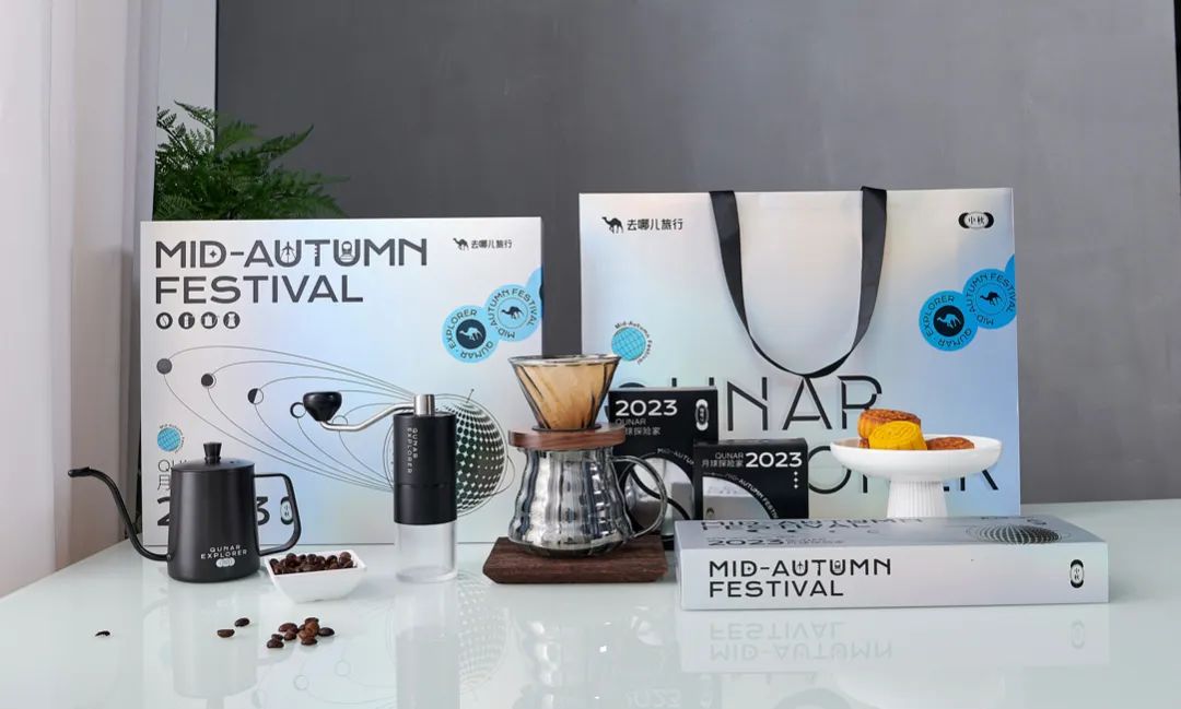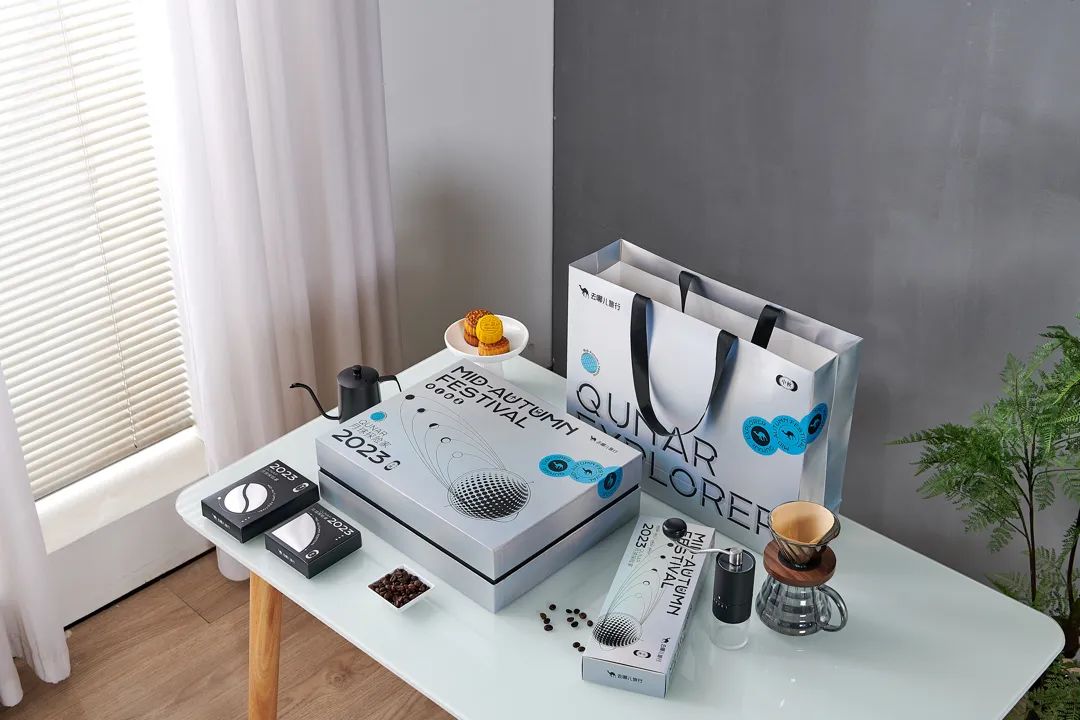 礼物主要就是手冲咖啡套装,包括:香醇咖啡豆、手动磨豆器搭配手冲咖啡壶,无时无刻,只要你想,一口进入自我“宇宙空间站”,释放压力,感受失重,这个这几年都很流行。当然还有月饼。