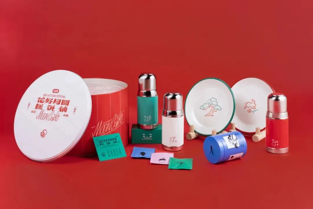 今年中秋小红书化身传统糕饼铺,打造了限定款主题糕饼礼盒——花好月圆糕饼铺。礼盒有传统酥饼,还有绿、白、红三色可选的复古保温杯,搪瓷盘子很复古(带支架),盘子分别印着印有玉兔和桂树,最后还有袋泡茶,有茶和杯、有月饼、有盘子,貌似就缺了一点红色的枸杞。
