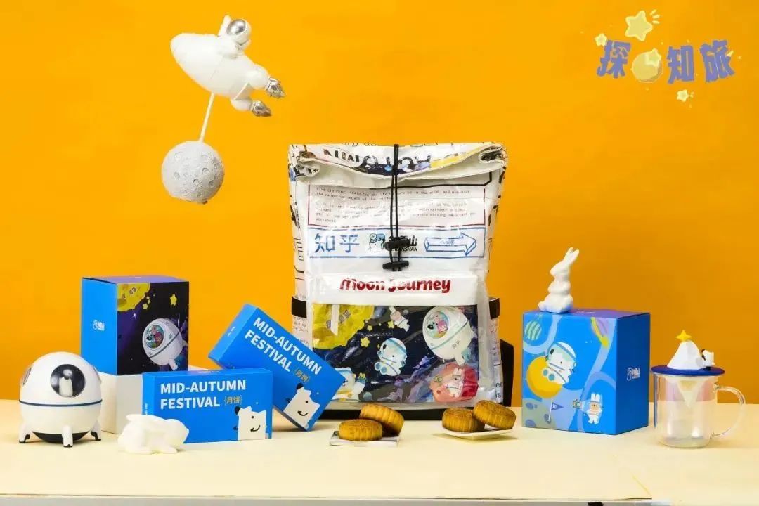 知乎的月饼礼盒主题为探月知旅。整体以蓝色为主色调,礼盒包含了一个防水的知乎定制登月包,一个登月仓形状的加湿器,一款可以放茶叶的玻璃杯,两盒月饼,充满科技感的同时也是实用性十足。