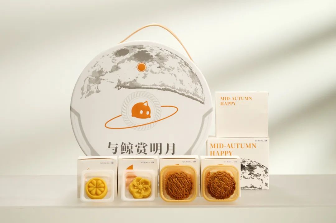 今年的中秋礼盒主题是“与鲸赏明月”,将扫地机器人和月球两种元素融合设计,橙色圆月寓意月满团圆,白色的机器人寓意家净无尘。礼盒内含2块月饼、2块绿豆糕、1个南方丝巢真丝睡眠眼罩、1盒Manner挂耳咖啡、1张中秋贺卡,主打一个实用贴心。