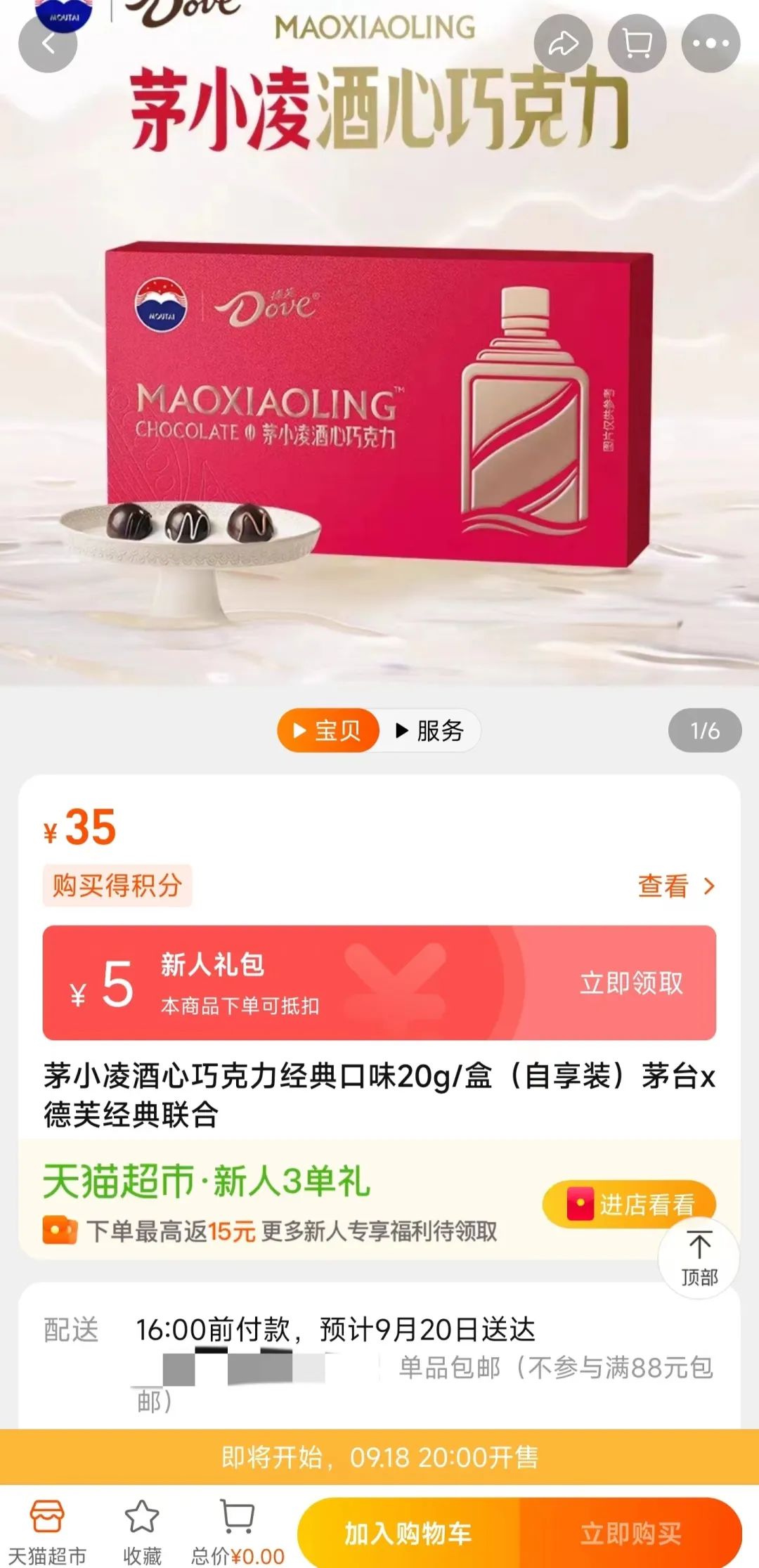 9月还未过完,茅台马不停蹄地官宣了第二次联名。相比对国人来说略显猎奇的酱香拿铁,和德芙联名的酒心巧克力听起来算是不那么出格的产品。趁着酱香拿铁的余温,茅台意料之中收获了一大波热度。据了解,9月16日15:30,茅台德芙联名的“茅小凌酒心巧克力”在多个平台开售后“秒空”。目前的销售策略为9月17-20日每天固定时间开售。