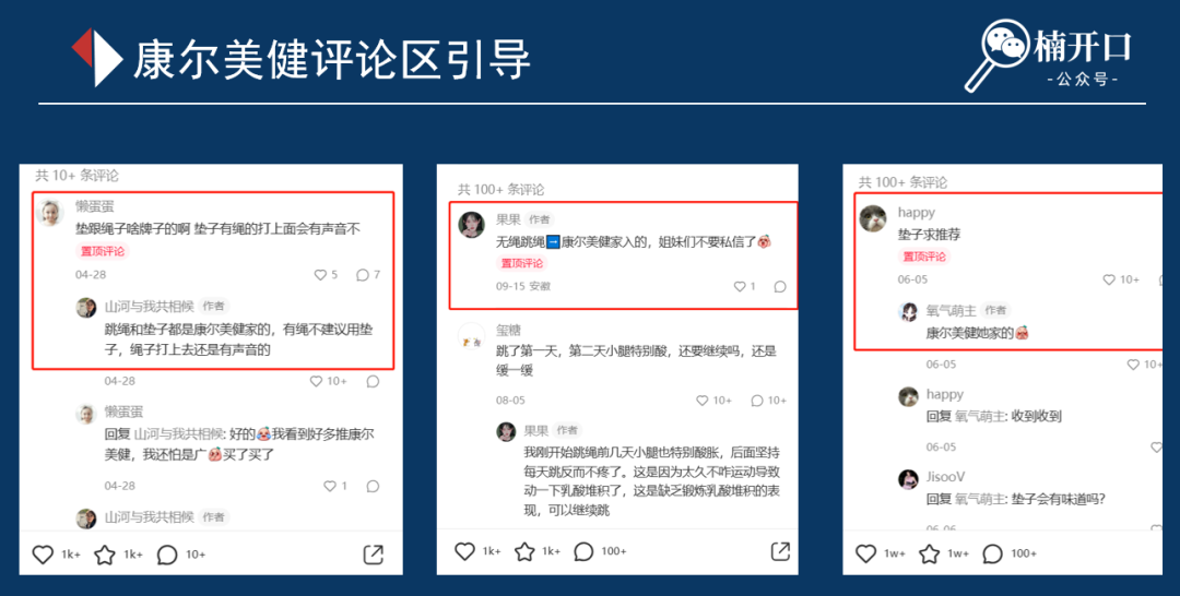 4. 评论区交流跳绳减肥打卡的日常;笔记作者迎合回答相关提问,不着痕迹的打出淘宝搜“康尔美健"的广告,达到引流的效果。