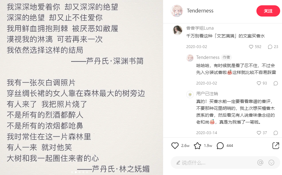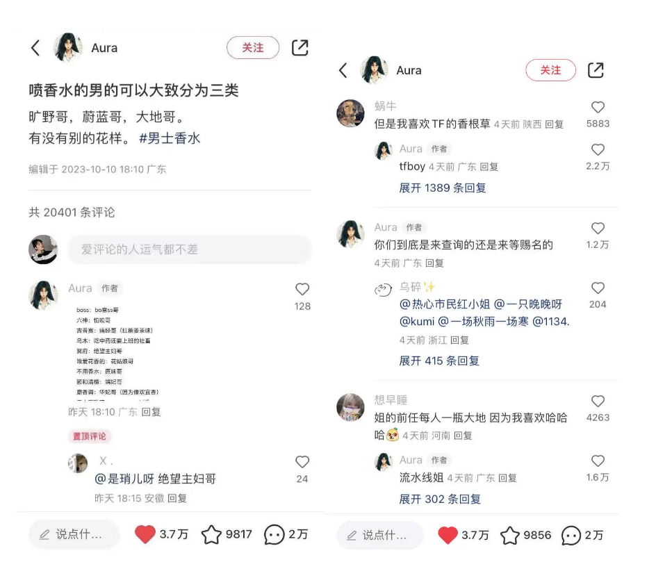 借消费者之口来给自己做广告,真实感、代入感和归属感就这么自然而然产生了;不直接描述香味,偏爱描述环境对香味的反应,更是把想用香水立人设的心理琢磨透了,哪怕是对“香评诈骗”保持高度警惕的人也容易放下戒备。