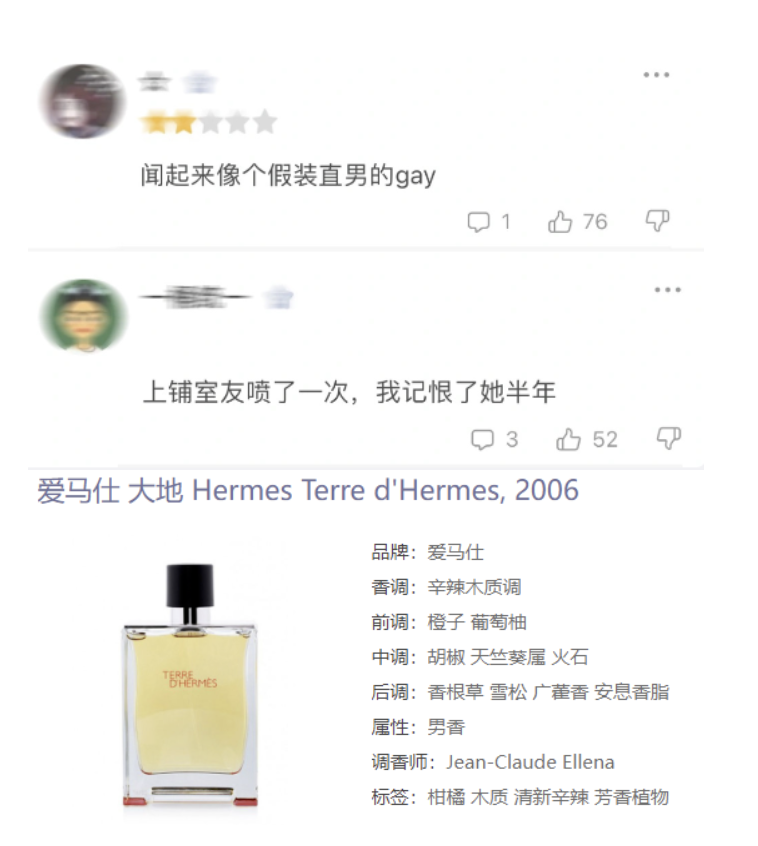 段位更高的香评,直接把“买家秀”也给揭穿了,越过描述香味的阶段,直接“闻香识人”,用香水给人分了类:“喷香水的男的可以大致分为三类,旷野哥、蔚蓝哥、大地哥。”