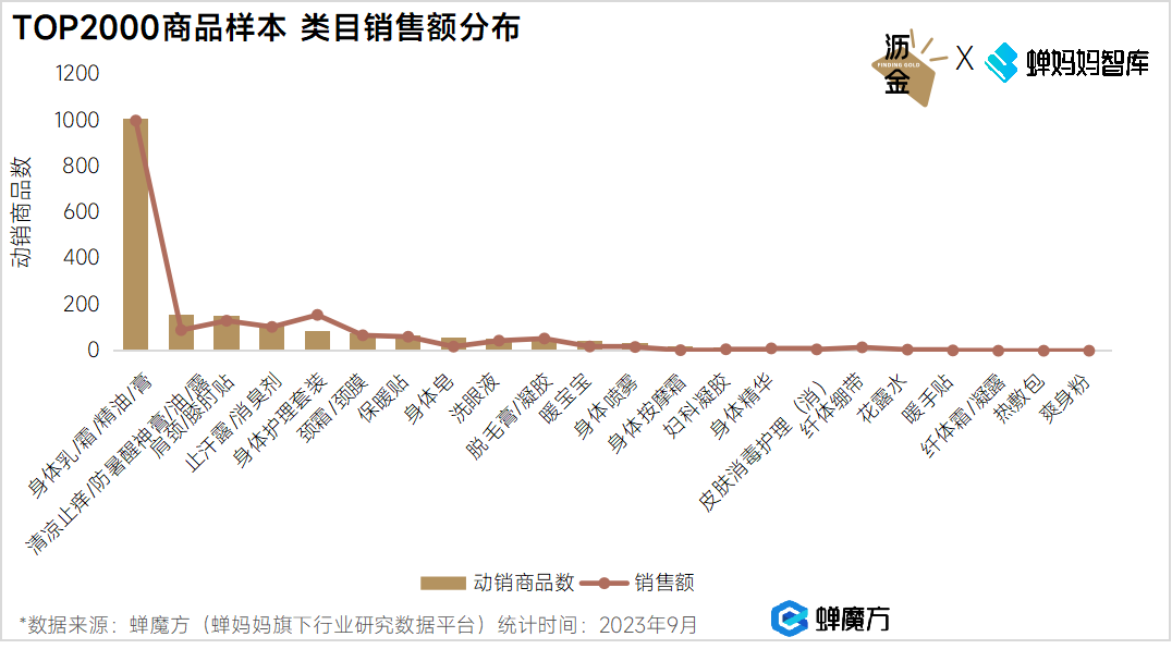 身体乳/霜/精油/膏动销能力强,是主要增长引擎,动销商品数和销售额远高于其他商品。