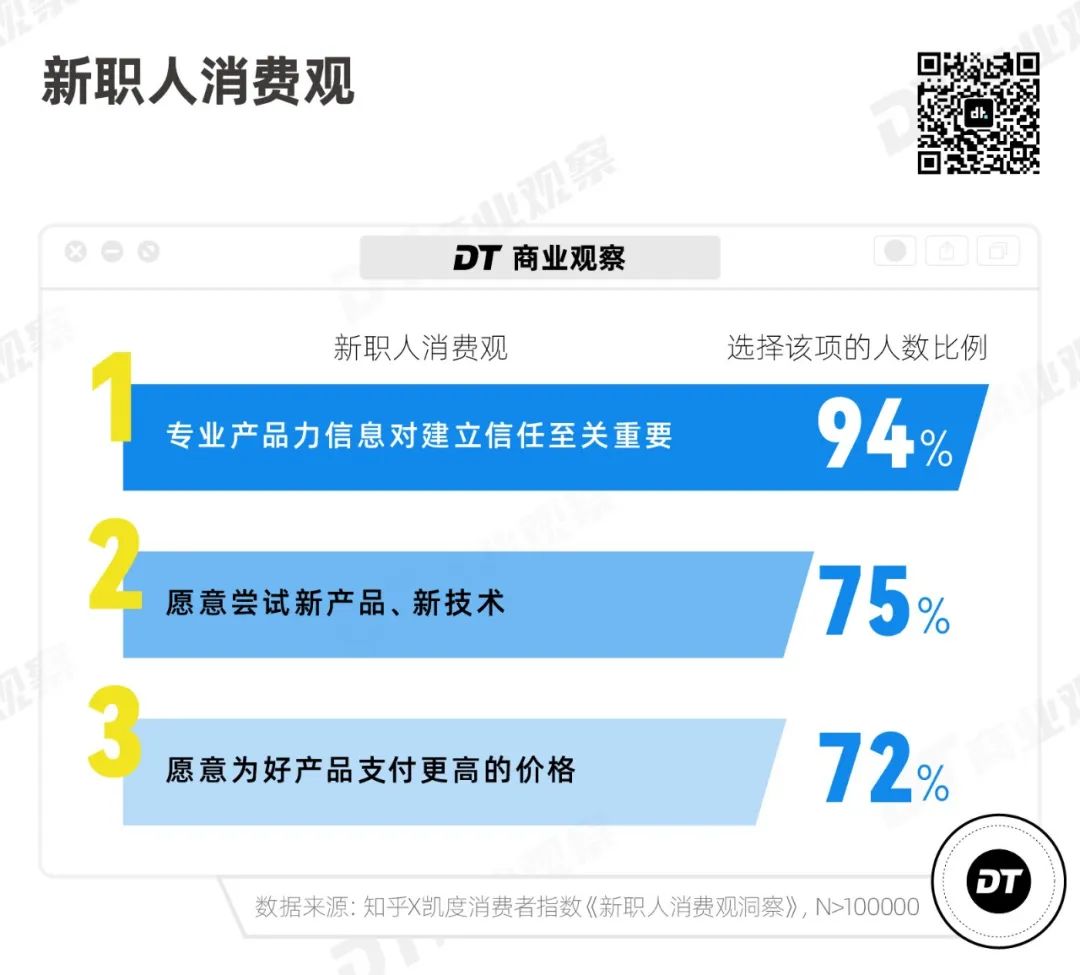 知乎与凯度消费者指数共同发布的《新职人人群洞察白皮书》显示,94%的新职人认为专业产品力信息对建立信任至关重要,75%的新职人愿意尝试新产品、新技术,超72%的新职人愿意为品质支付溢价。