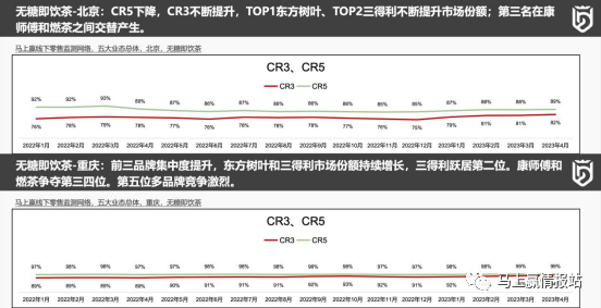 不过纵使品牌间打得火热,这个赛道格局已逐渐固化。在马上赢研究院发布的无糖即饮茶分省市CR3、CR5数据中,CR3的最低值出现在北京,达到82%,而最高值在部分地区甚至达到94%。