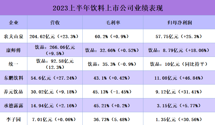 财报数据显示,2023年上半年农夫山泉、康师傅、统一、东鹏饮料、养元饮品、承德露露、李子园等饮料公司总体都实现了营收和净利润上涨,而农夫山泉以60.2%的高毛利率遥遥领先,净利润超其他几家之和。