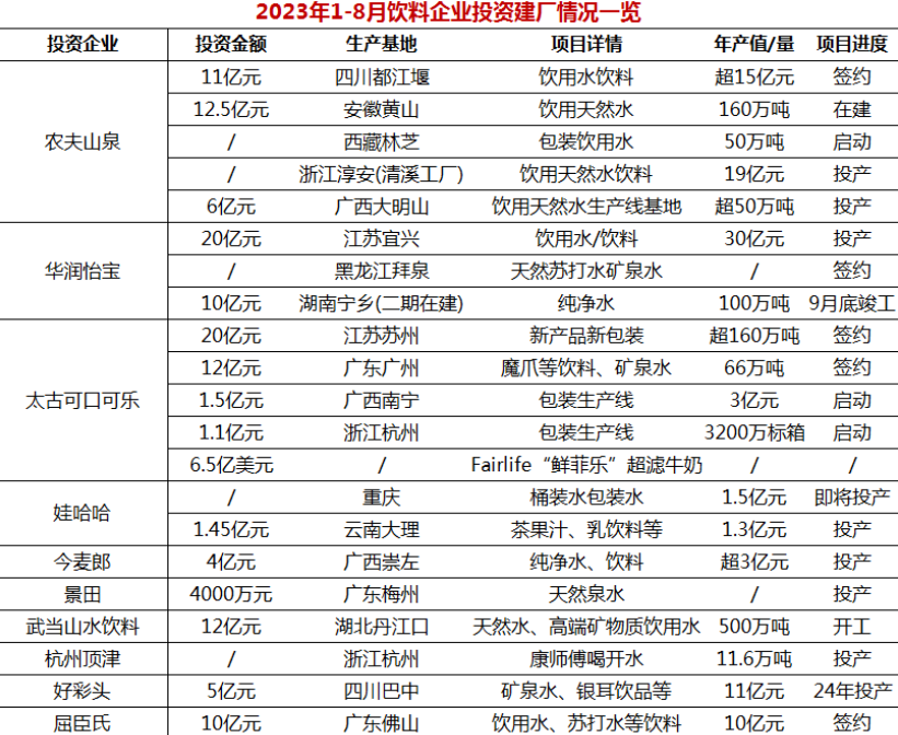 今年1~8月份,据食品板不完全统计,23家饮企发力瓶装水,相关投资设厂事件高达34起。