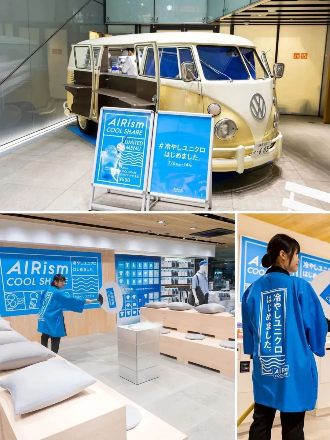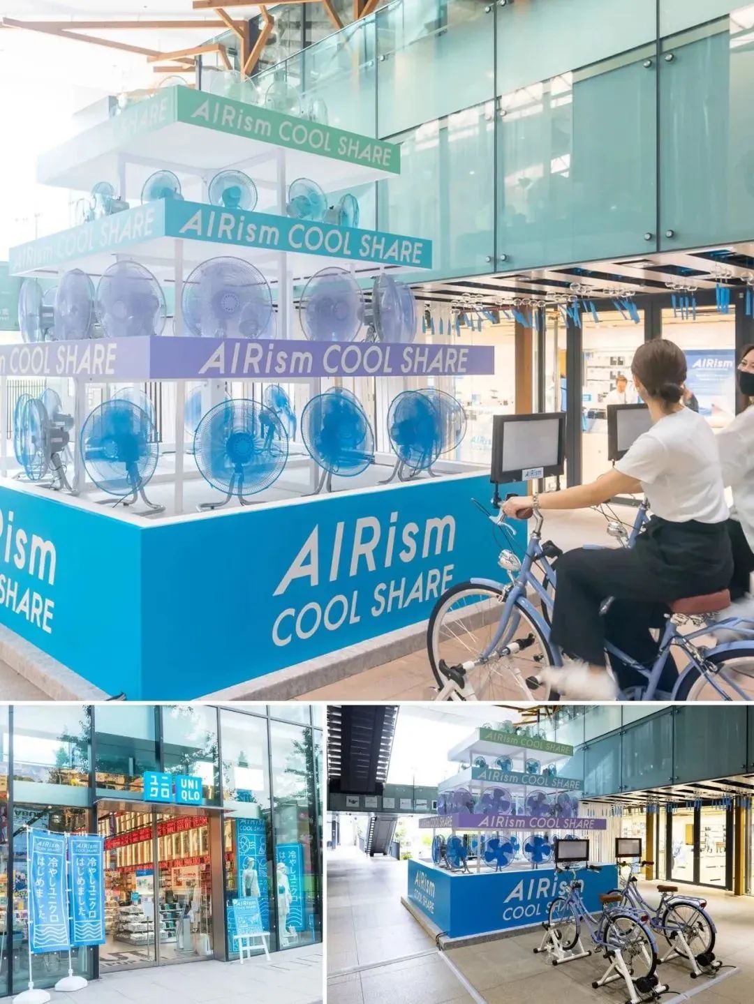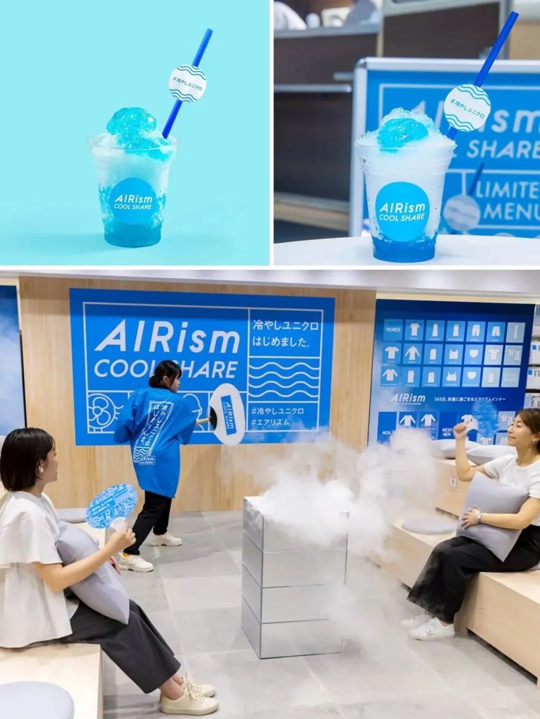 店铺的陈列中,有着以“Airism Blue”为主题的LOGO;还有风扇塔和冷却桑拿室区间,给顾客降降温,给人凉快舒适的感受。