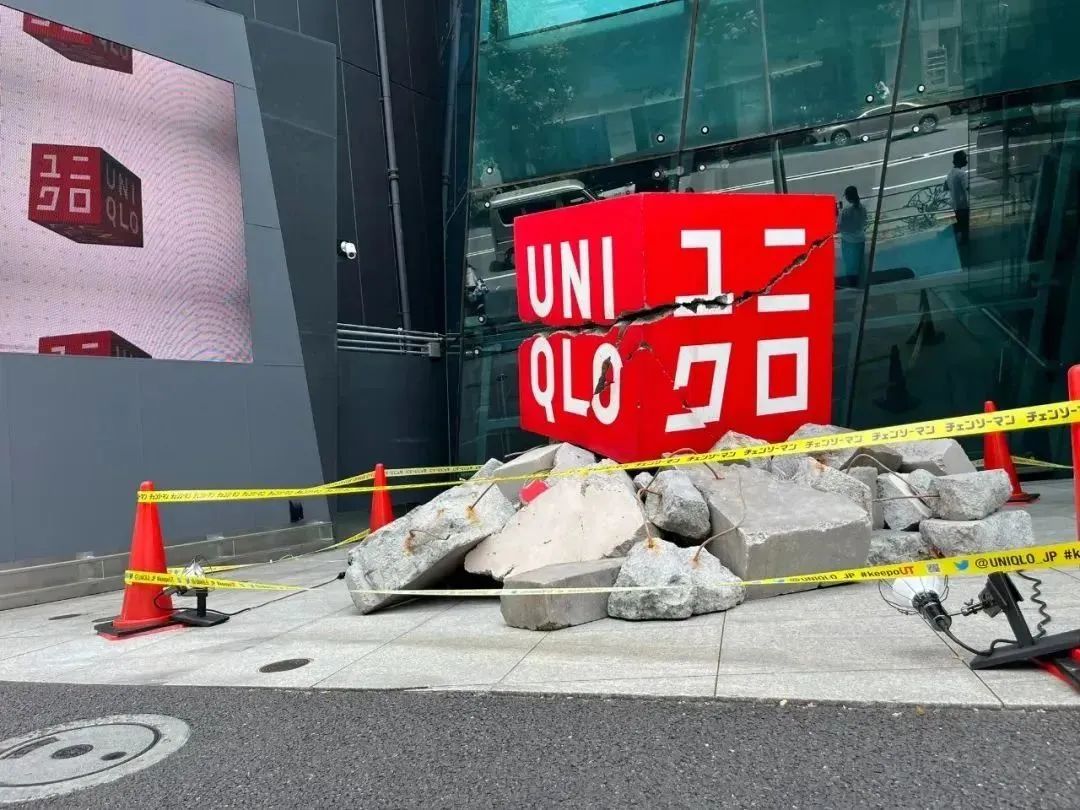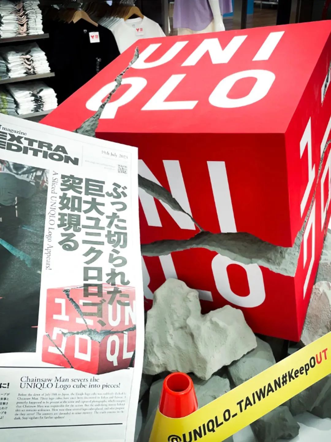 除此之外,优衣库还和漫画《链锯人》合作,在日本东京原宿明治大道的神宫附近推出一个裂开的LOGO。