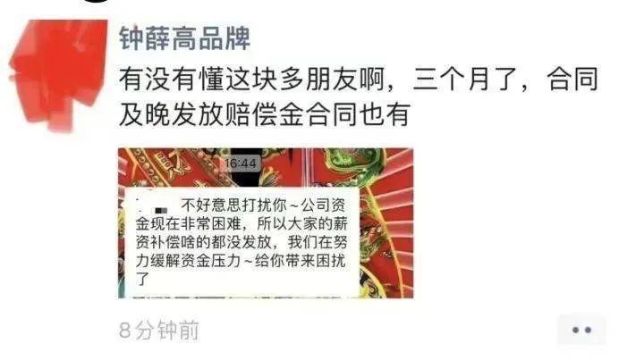 近日,有自称钟薛高客服部门“前员工”的网友表示,在公司效益不好并优化期间,该员工等6人与公司人事提出优化补偿,并签署了离职同意单,约定补偿金和工资10月15日发放,当天公司未履约。该员工讨要说法时得到的回复是公司账户上没有钱补偿,要等,但没有具体的时间点。