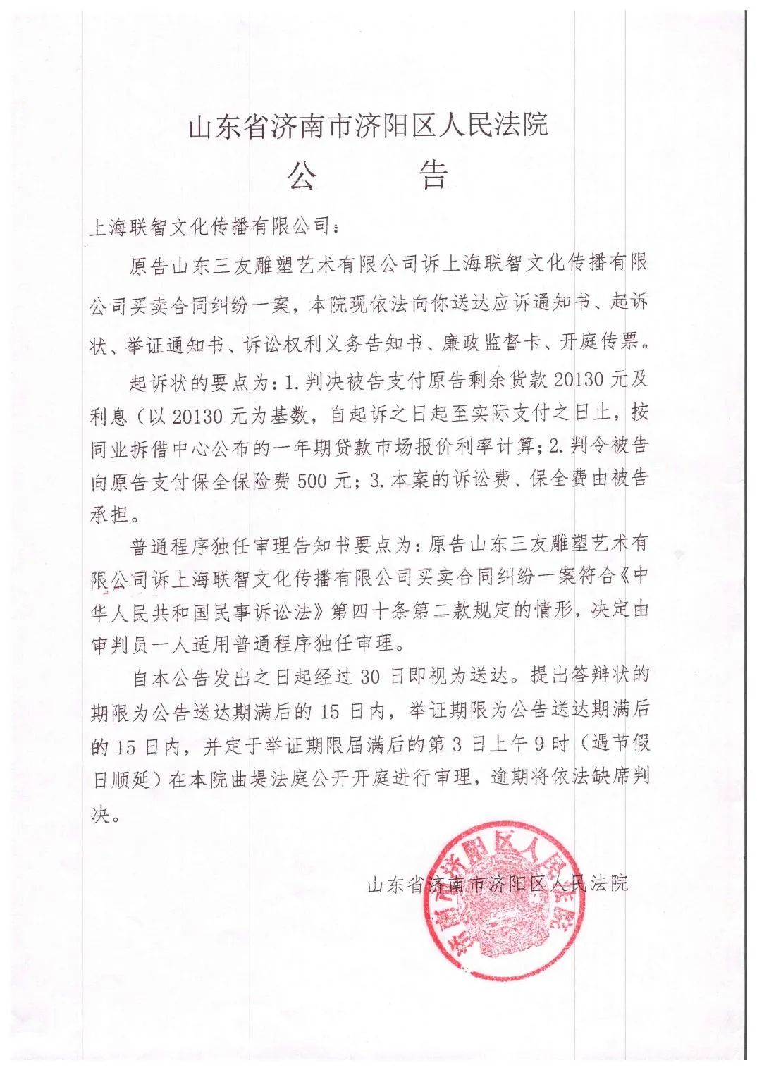大汪还查到今年山东三友雕塑艺术有限公司向山东省济南市济阳区人民法院诉上海联智文化传播有限公司买卖合同纠纷一案,涉案金额20130元。