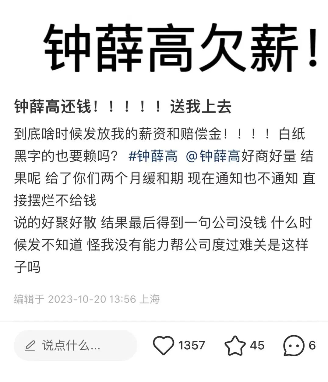 01.多位自称钟薛高员工,爆料称被拖欠工资
