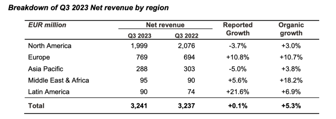与 2022 年第三季度相比,2023 年第三季度各地区的有机增长情况,美国为 2.7%,欧洲市场和其他欧洲市场为 5.7%,英国为 4.4%,拉丁美洲为 19.2%,亚太地区为 2.5%。各地区的有机增长率下降情况,中东和非洲下降 10.8%,其他北美地区下降1.7%。