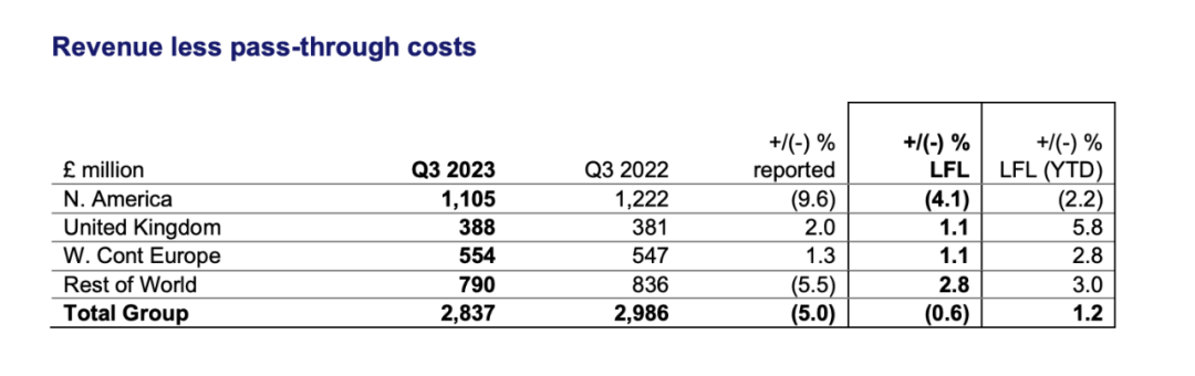 首席执行官Mark Read说:“我们在第三季度的业绩表现低于预期,并继续受到第二季度谨慎支出趋势的影响,尤其是在技术客户方面,夏季对群邑集团的影响比上半年更大。”