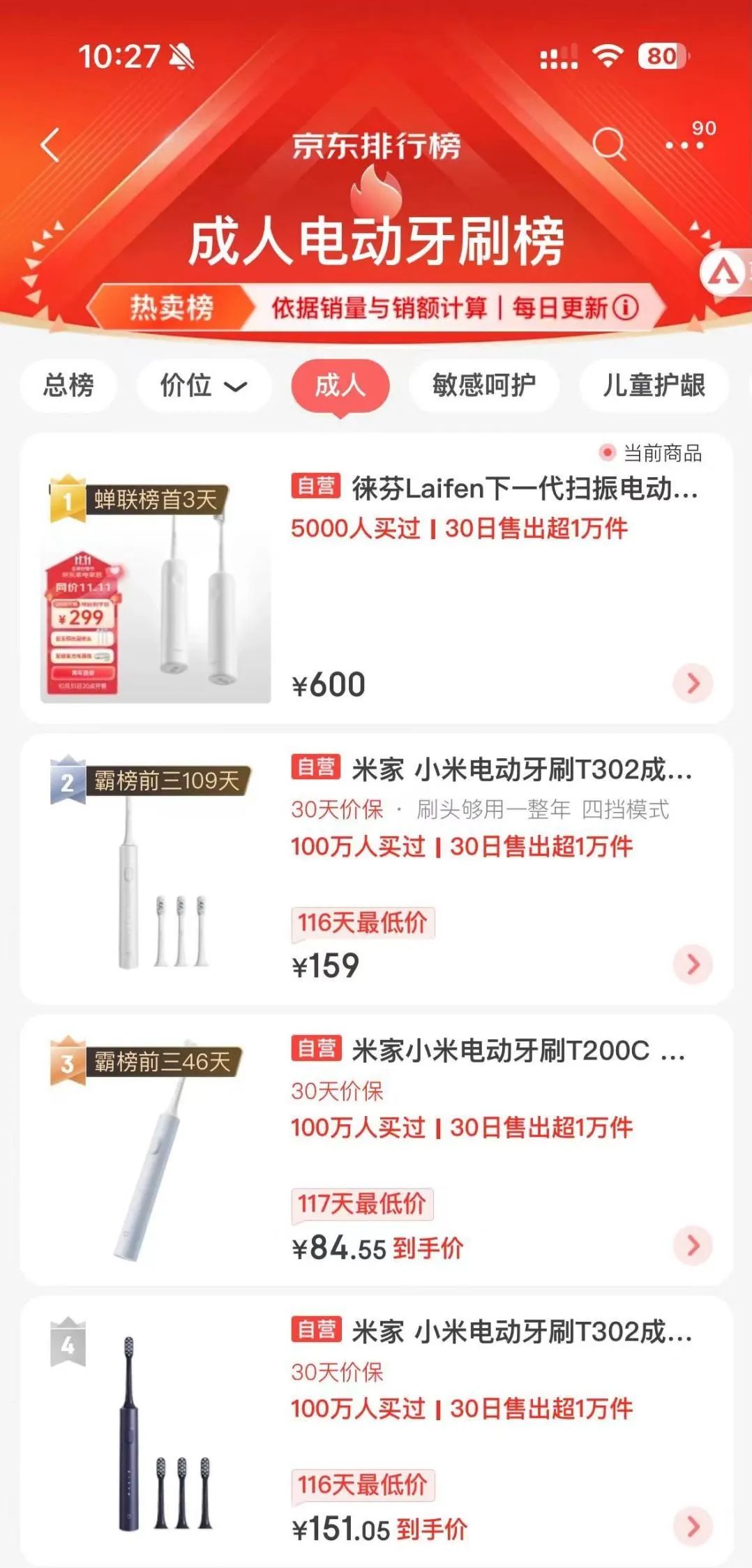 10 月 16 日,徕芬科技发布了全新品类“扫振电动牙刷”,奔着今年双十一而来。尽管定价偏向中端,但徕芬的销售反馈看起来却还不错:预售达 2 万台,4 分 27 秒全部售罄;在京东电动牙刷排行榜上,已超过小米位居第一。